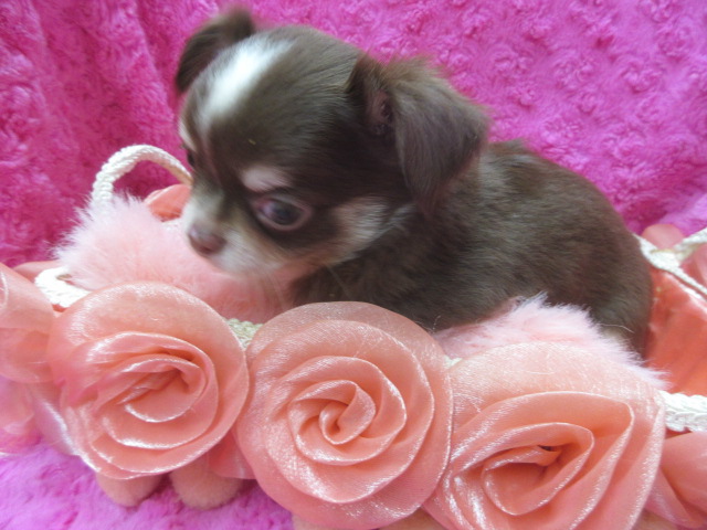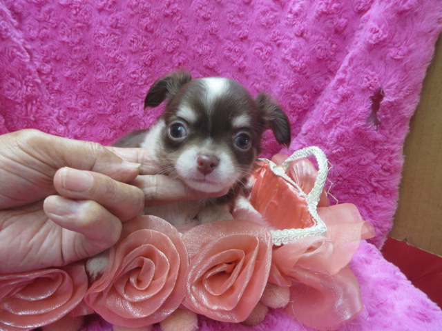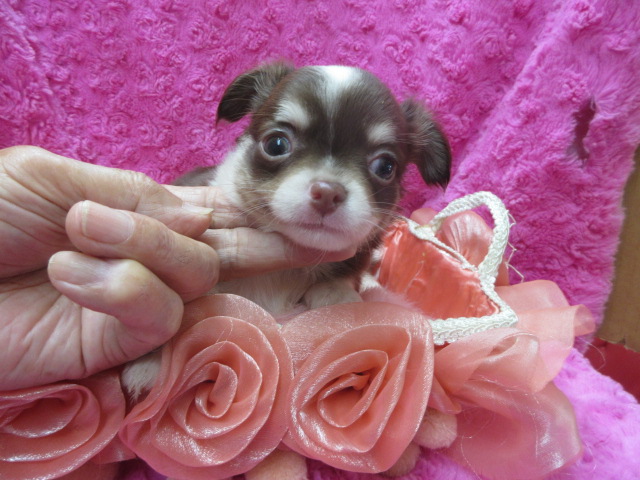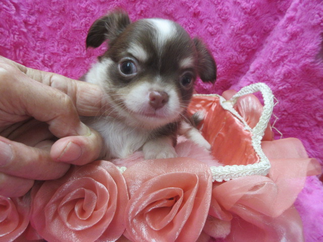 子犬詳細 [No.178] ロング 毛色 チョコクリーム&ホワイトマーキング 性別 男の子 誕生日 2025年7月20日 価格 99000 飼いやすい 人なつっこい かわいい 吠えない 問い合わせをする